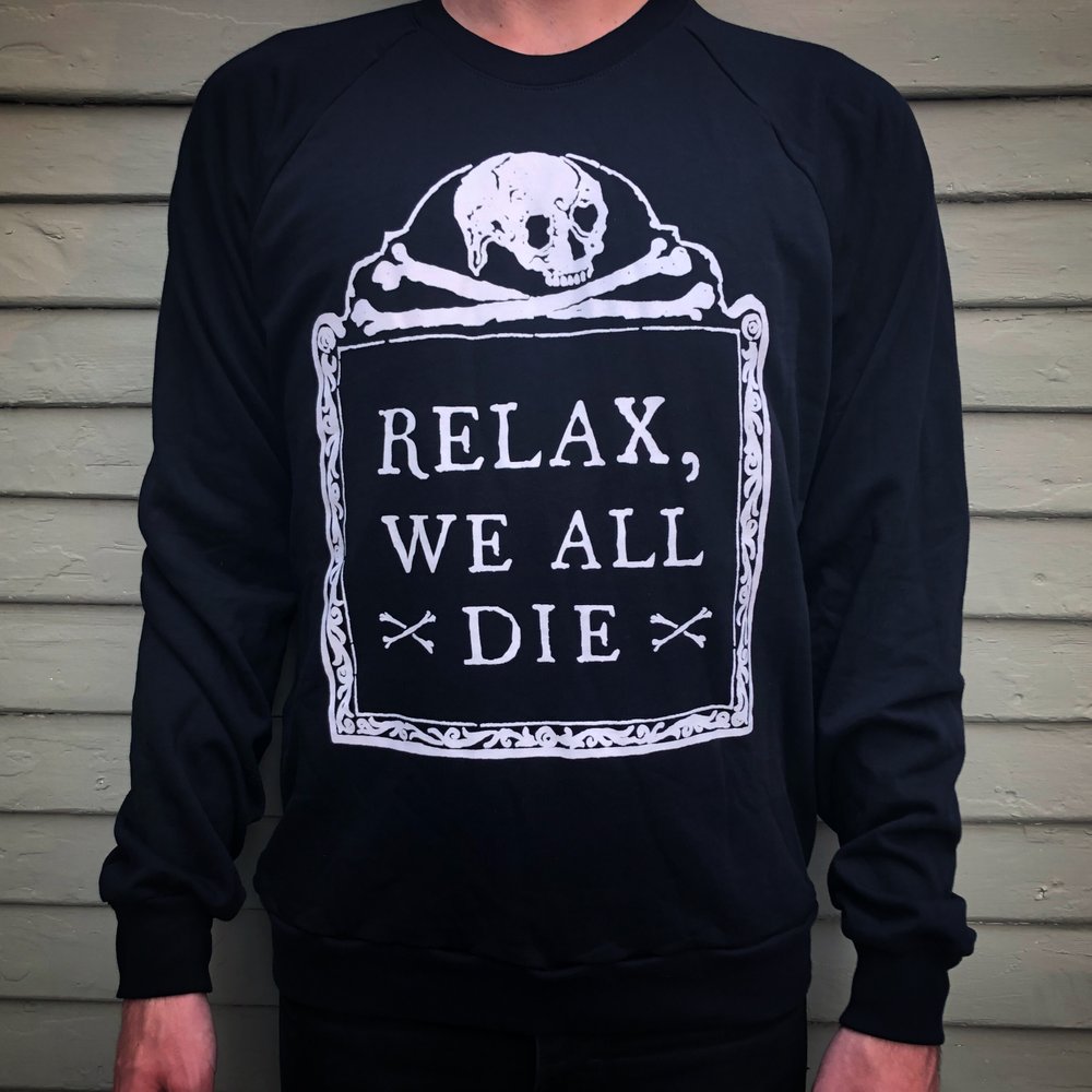 Pilou-pilou : coup de cœur pour le sweat shirt « Relax, we all die » (en anglais).